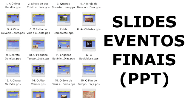 Baixe aqui os slides dos 19 capítulos do livro Eventos Finais de Ellen White. POWER POINT EVENTOS FINAIS Para baixar as apresentações clique sobre o tema desejado e quando abrir clique em `Arquivo`, a primeira opção do menu, e depois em `Fazer Download`. 1. A …